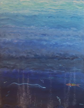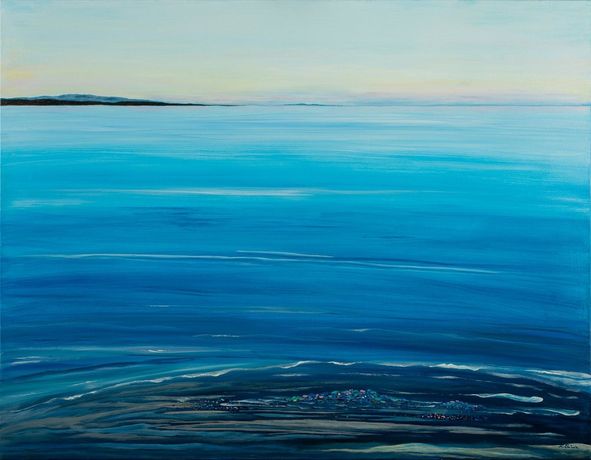 本作以丙烯颜料在画布上描绘出海洋与花卉的融合意象,色彩柔和,表现出Salonia对自然纯净状态的向往与守护。作品呼应展览主题,强调人类与大海的情感联系和生态责任。