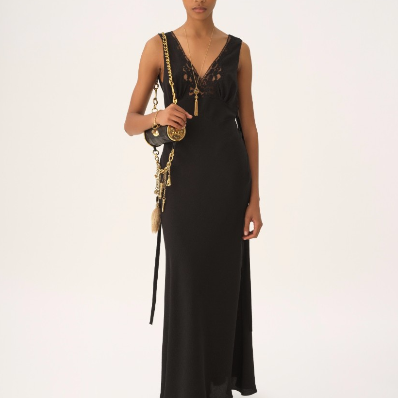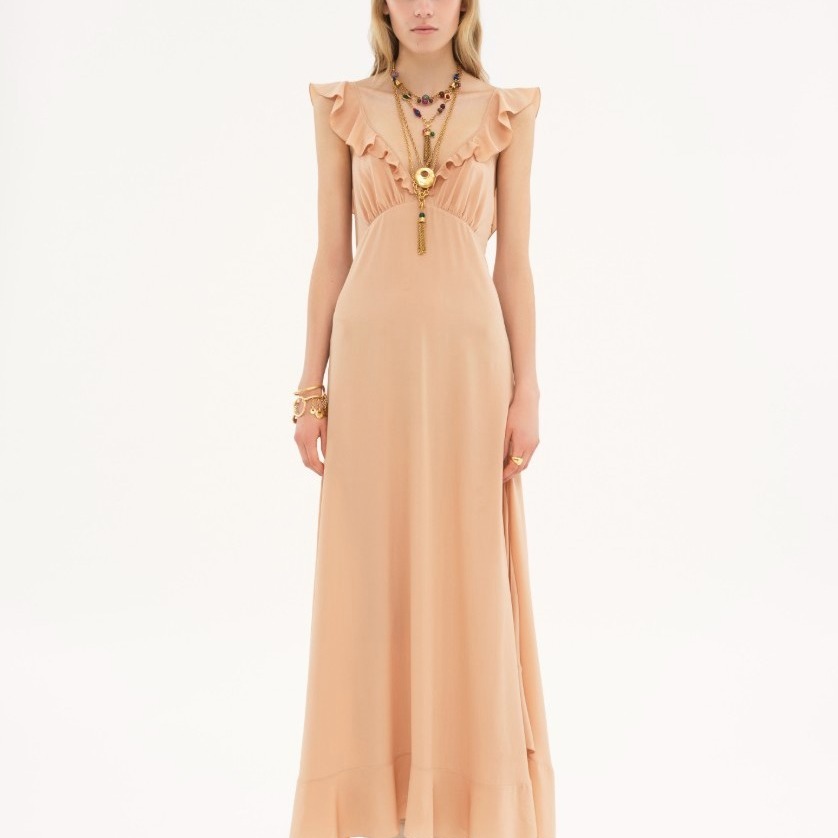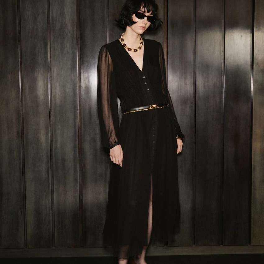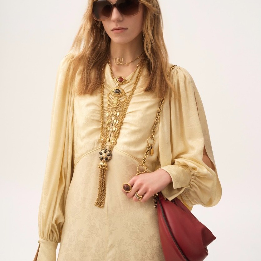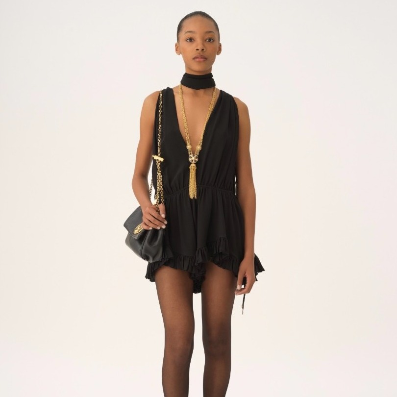 Chloé永远是那种带着“浪漫文艺”的高级感。派对礼服虽然不多,但每一件都像艺术品。主打的是轻纱与流苏结合的梦幻礼服裙,配上自然垂感的面料,温柔感直接拉满。穿上Chloé,你就是那种“光靠气质赢全场”的女主角。