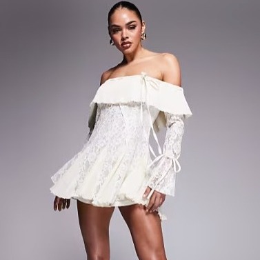 Murci exclusive lace bardot fit and flare godet detail mini dress