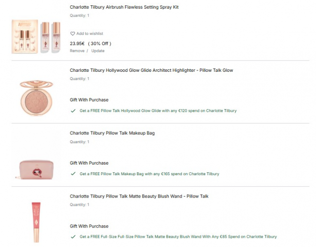 🎁 品牌满85€送正装腮红液#Pillow Talk1支!满120€加赠正装高光腮红1个!满165€再送化妆包1个!
