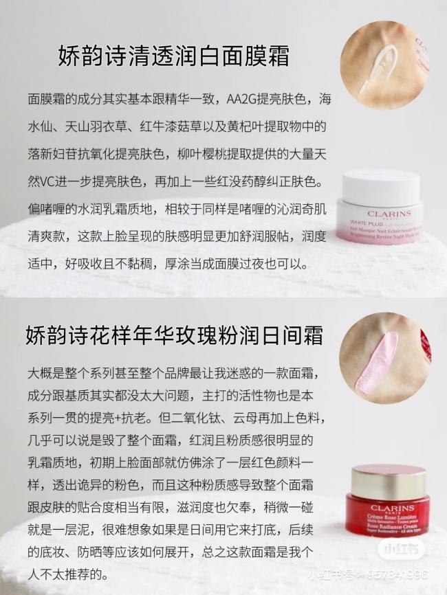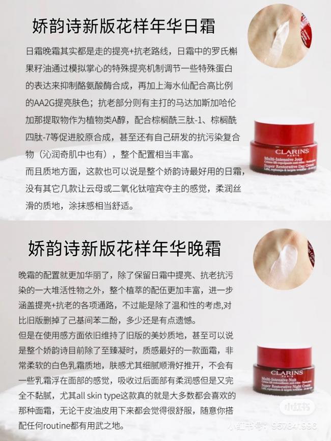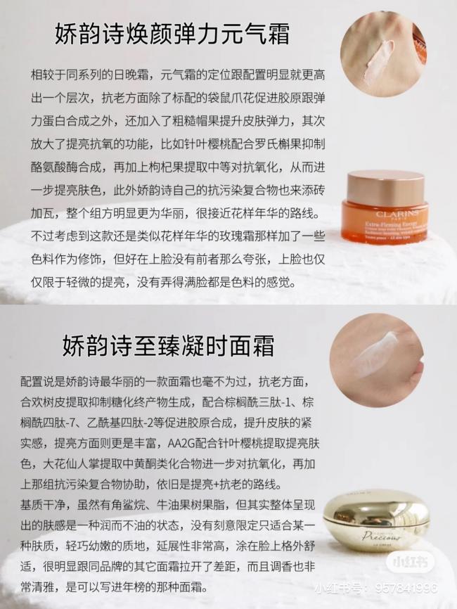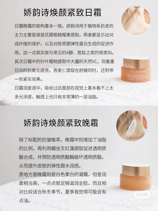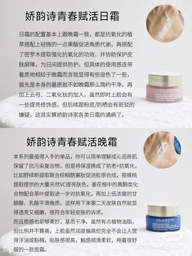 ✨青春赋活日霜:工作的竞争、压力,快速的生活节奏,疲劳都会体现在你脸上。娇韵诗赋活日间霜凭借其最新的科研成果,结合植物精粹,精准定位修护受损细胞,在日间持续抗氧化,淡化细纹,滋润肌肤,提升您的肤色,让你的肌肤焕发活力,重现青春。