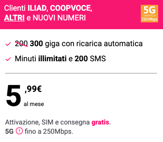 使用 TIM 网络,便宜实用,老用户 / 转号 / 新号码都能办!限时优惠5.99€ 300Go+5G 网络+无限通话
