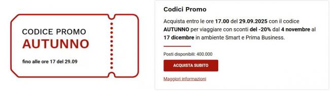 在2025年9月29日17:00前,使用折扣码 AUTUNNO,即可享受11月4日至12月17日期间8折的订票优惠(Smart 和 Prima Business票适用)