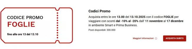 在2025年10月13日13:00前,使用折扣码 FOGLIE,即可享受11月11日至12月17日期间9折至8折的订票优惠(Smart 和 Prima Business票适用)