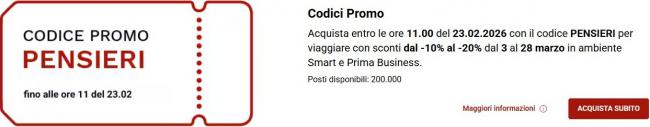 在2026年2月23日11:00前,使用折扣码 PENSIERI,即可享受2026年3月3日至2026年3月28日期间9折至8折的订票优惠(Smart 和 Prima Business票适用)