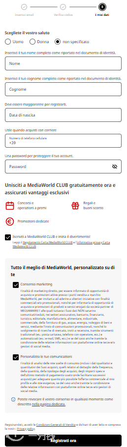 6.跳转进该页面,填写信息并勾选订阅,点击【Registrati ora】即可完成注册!