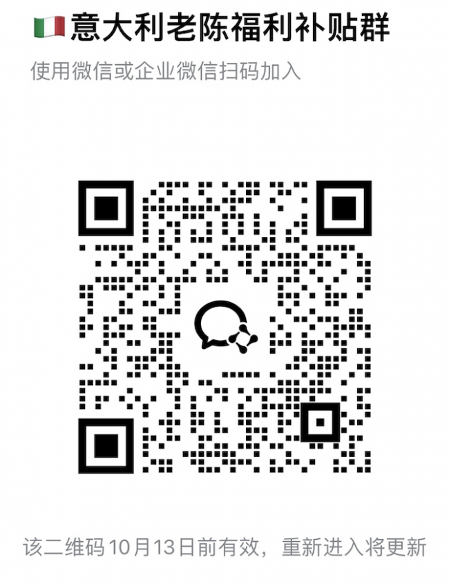 💥 我们这次的🇮🇹意大利福利补贴群会同步折扣信息,老陈帮你找好折哦!