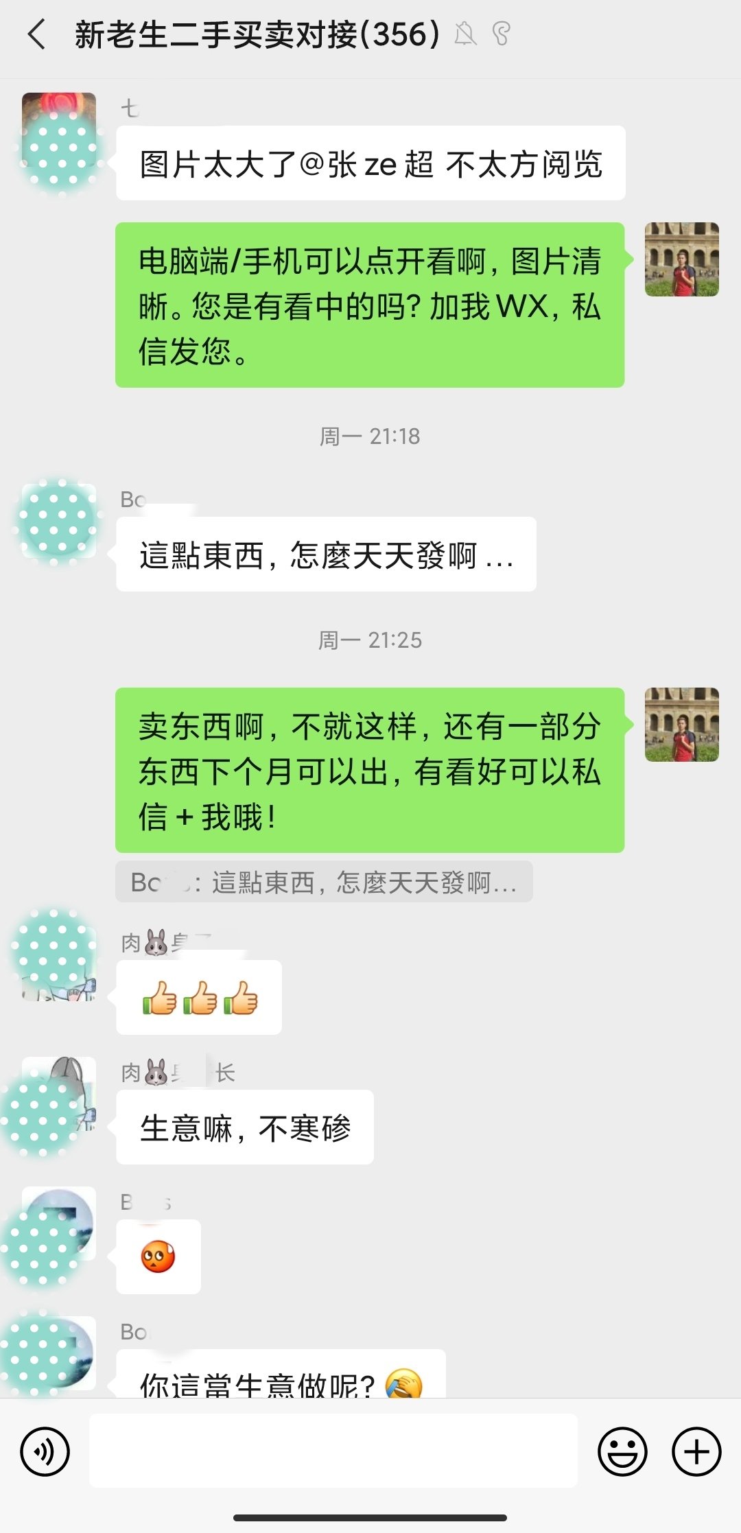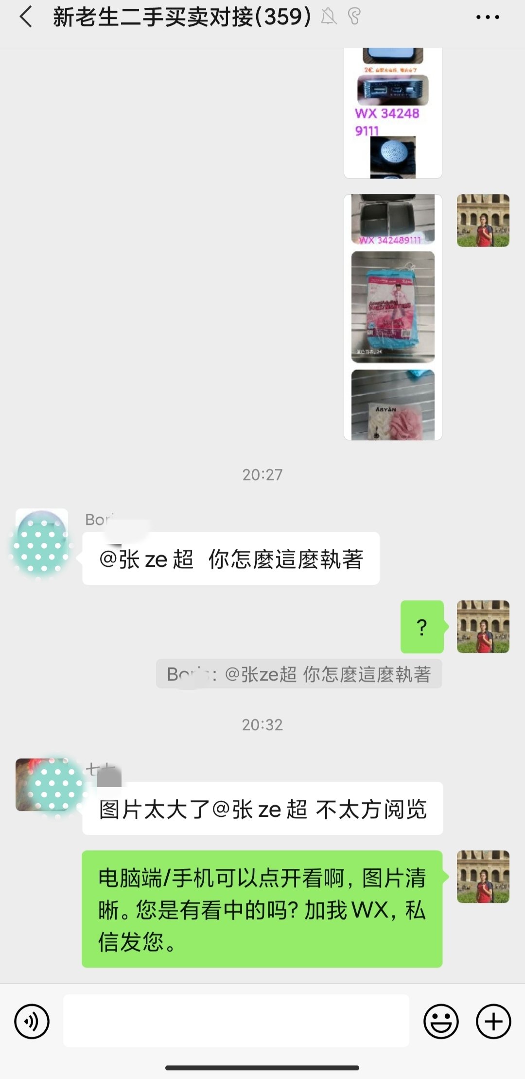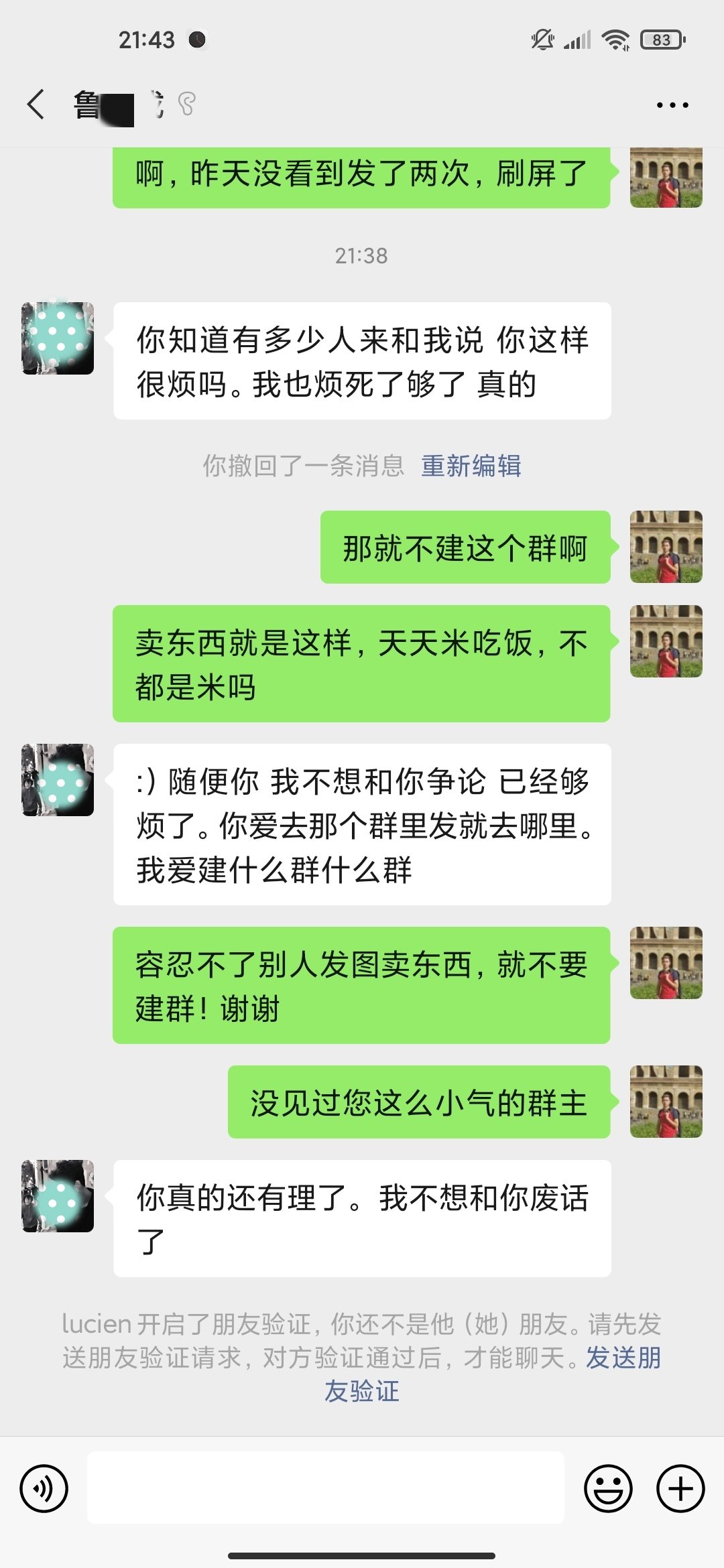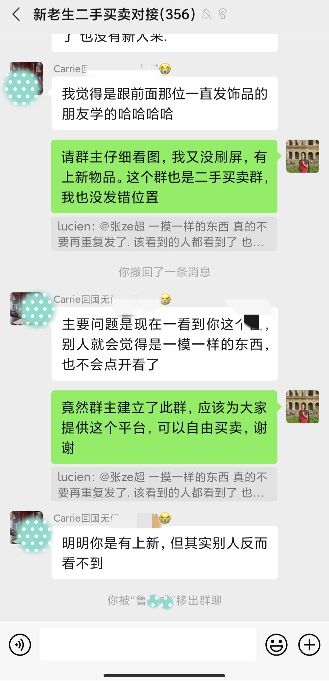 这位群主是某巴黎在读博士,自己平时把自己宣传的多么牛,行事风格不过如此。某群主创建了新老生买卖群,邀请我进群,在遵守群规情况下,我正常发图卖东西有啥错,一天就发图一次。唯一那天误发了两次,也即使提醒我,我也说明了情况,也没有违反群规。前段时间我没有及时更新图片,WX群里有部分成员反应,我卖东西发图一样,我第二天及时更新了商品信息。今晚就无端踢我拉黑,大家可以言论自由的评评理!🙄
