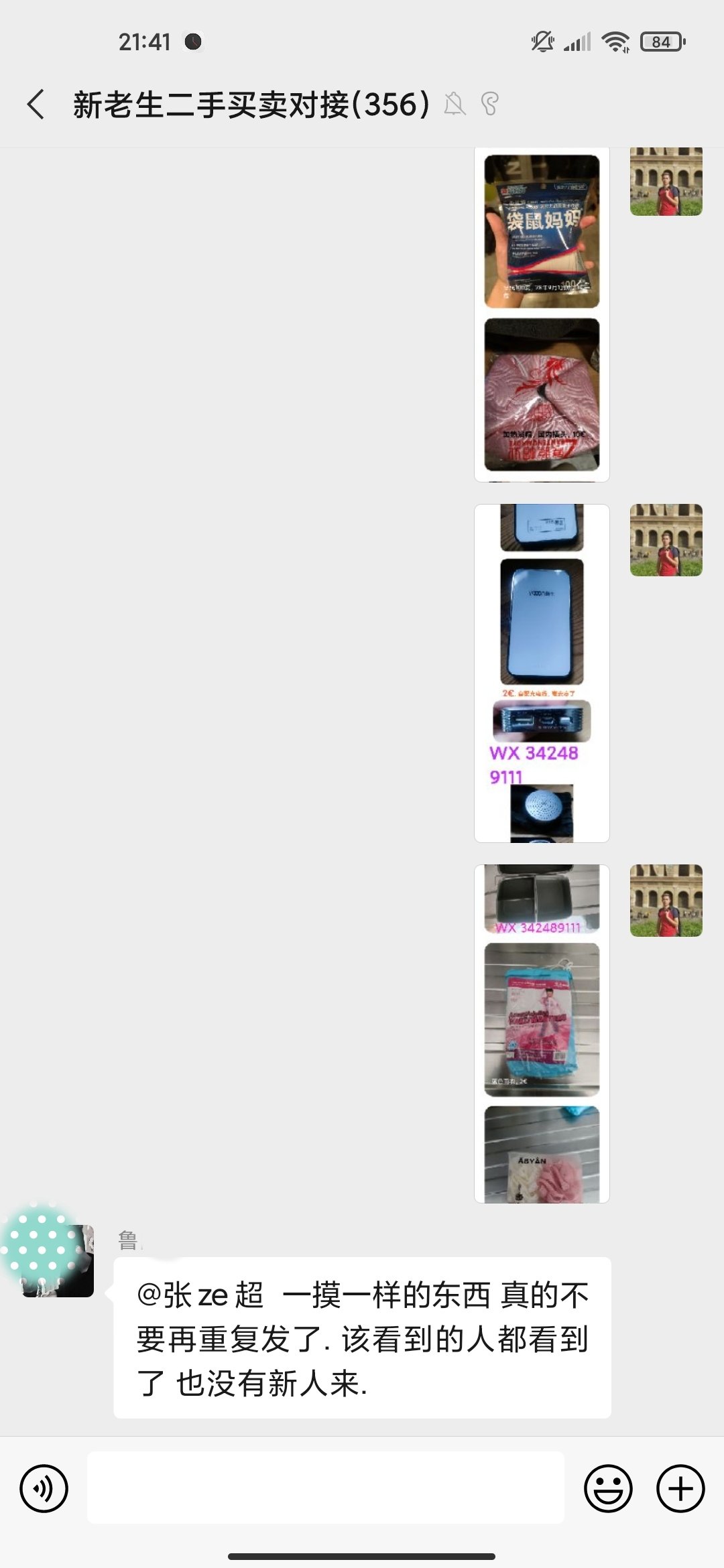 这个群是新老生买卖群,如果群成员觉得很烦,可以选择消息免打扰或屏蔽/退出此群,另外如果您不买东西,也没必要点开图片一一查看。跟买菜是一个道理,菜不好不新鲜,您可以不看不买,超市只是为大家和菜商之间提供了一个平台,选择权在群成员自己,我并未违规。