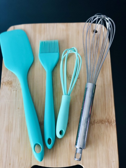 小号蓝绿色打蛋器,跟我在超市买的图中最右边普通打蛋器体积形成了鲜明的对比,还跟我已有的同色系的烘培工具很搭。打一两个鸡蛋更得心应手,不用一直担心会溅出去。